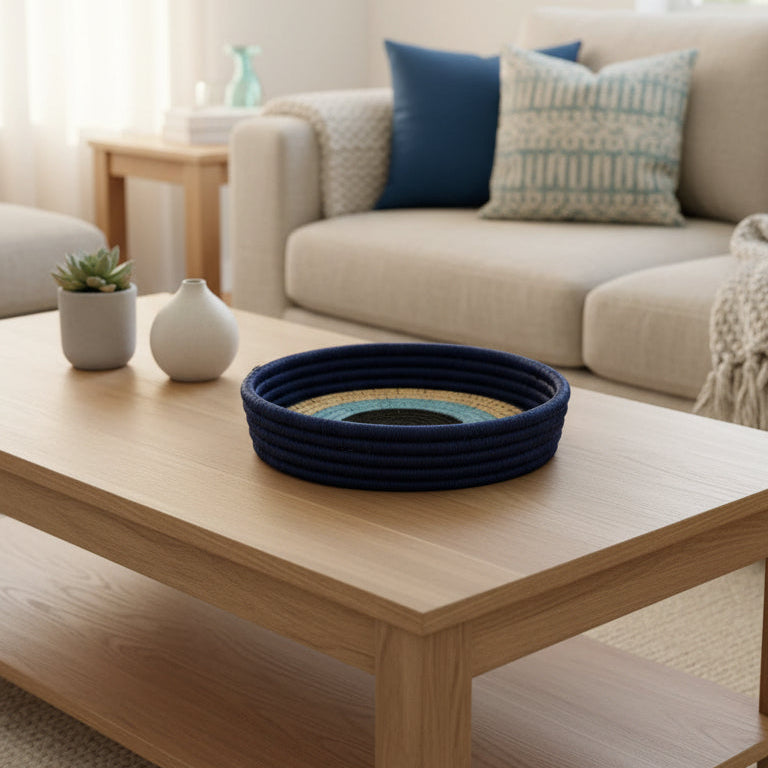 Add a touch of natural elegance to your space with our handcrafted Sabai grass tray. Featuring a trendy evil eye design, this eco-friendly tray brings warmth and texture to any room. Perfect for organizing essentials, serving snacks, or simply as a decorative piece, it’s a versatile addition to your home that blends sustainability with style. Each tray is meticulously made, showcasing the beauty of traditional craftsmanship and the charm of natural fibers